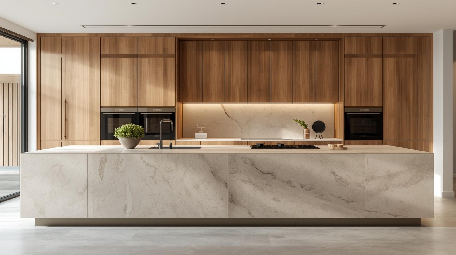 A nagy mintás, csillogó csempekombinációk helyett 2026-ban divatosabb az egységes lapos hátfal (slab backsplash) vagy a színben harmonizáló felület. Így nem vonja el a figyelmet a bútorokról, és könnyebb tisztán tartani. - Világítótestek és fényhangulat